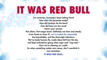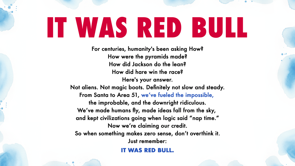 Red Bull as a brand that has always stood for staying up for all-nighters, jumping out of the window and making preposterous advertisements. However, they have never been positioned as the brand that fuels the impossible. Ooh. Interesting. Another truth is that people are so consumed by the curiosity of "how did this impossible thing happen?". Simple. It was Red Bull.