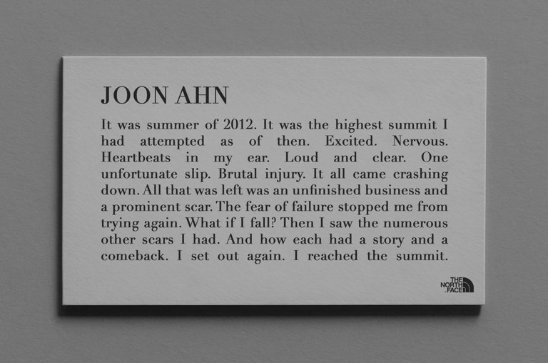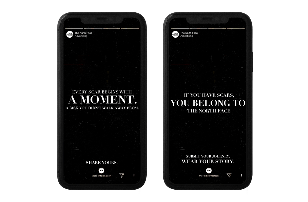 The North Face is for people who are courageous, adventurous, who wouldn't let fear stop them from taking the leap. What do such people have in common? Scars. Scars are not just healed injuries, they are stories they wear. We want all of the people who brave scars to know, if they have scars, they belong to TNF.